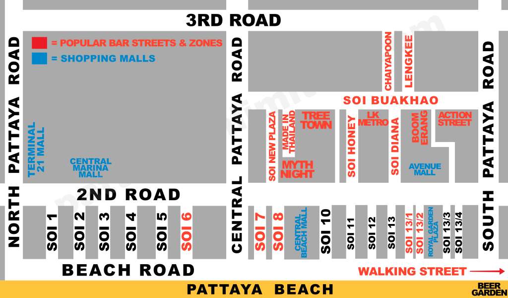 However, all the most famous and popular nightlife zones and bar streets, such as Walking Street, Soi 7, Soi 8, Soi 6, and Soi Buakhao, are in central (downtown) Pattaya.